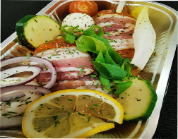 Italiaanse ovenrosbief Heerlijk stukje rosbief voor 2 personen in balsamico tijm saus, Parmazaanse kaas, lenteui, en tomaatjes. Bakje in voorverwarmde oven van 180 graden en wachten tot de gekleurde kop van de timer omhoog springt. 100 gram € 2,45 | |